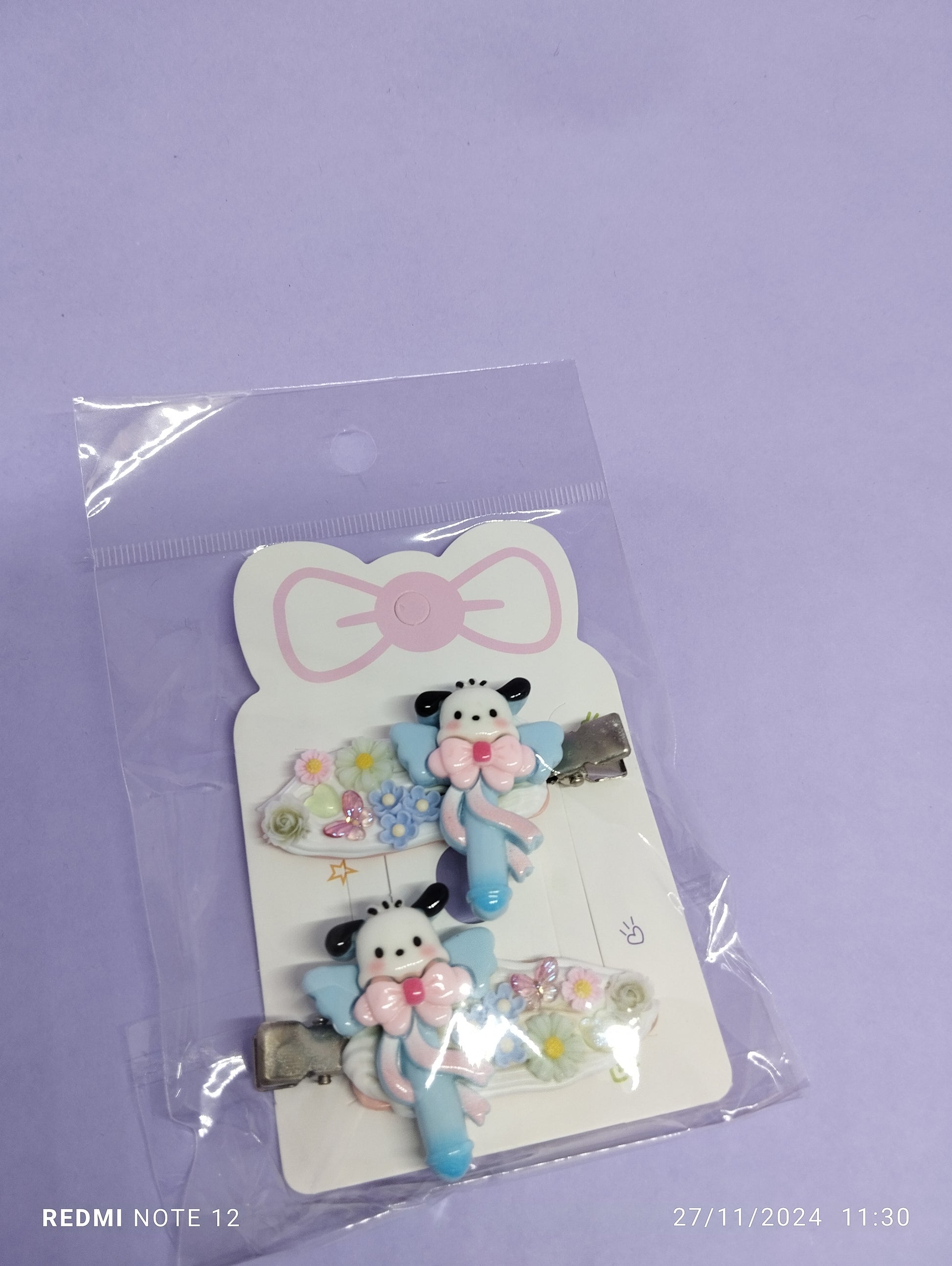 Barrettes plates avec décoration fausse chantilly breloques diverses et personnage en résine