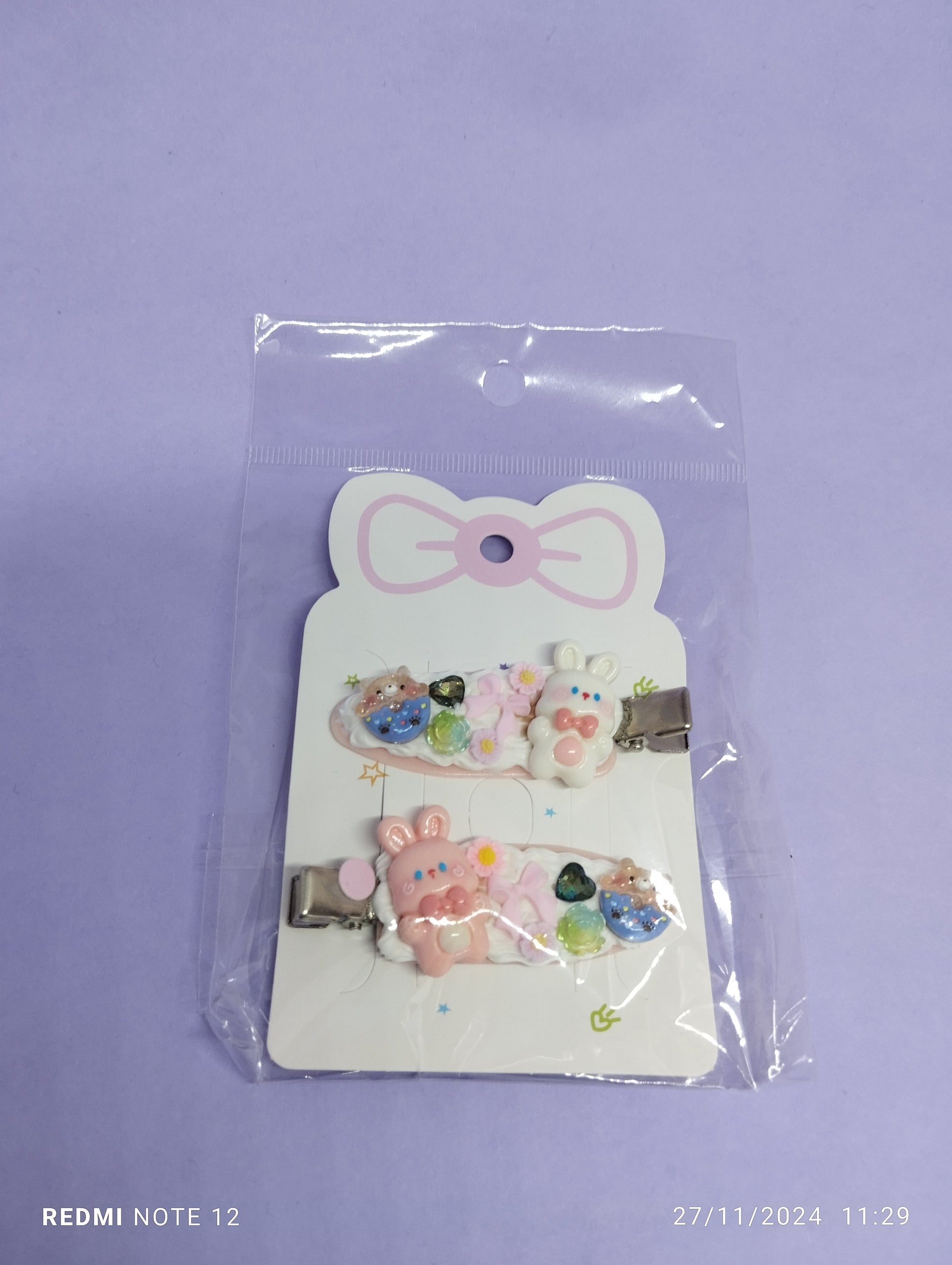Barrettes plates avec décoration fausse chantilly breloques diverses et personnage en résine